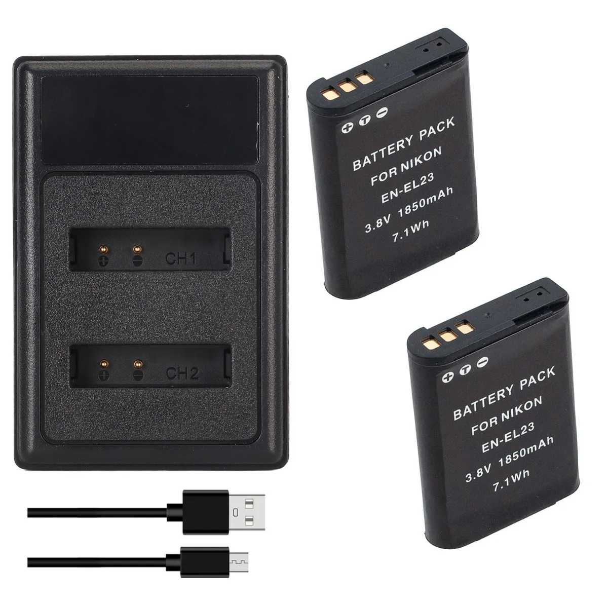 Kit essencial com bateria EN-EL23 de 1850mAh e carregador duplo USB com visor LED. Ideal para usuários Nikon que buscam recarga prática e desempenho confiável durante longas sessões de fotos ou vídeos.