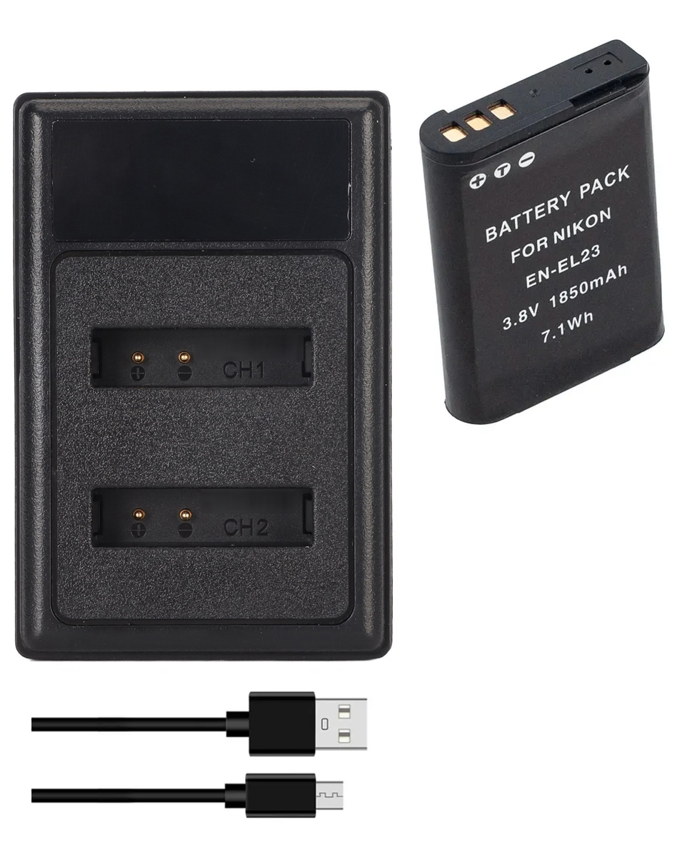 Kit essencial com bateria EN-EL23 de 1850mAh e carregador duplo USB com visor LED. Ideal para usuários Nikon que buscam recarga prática e desempenho confiável durante longas sessões de fotos ou vídeos.